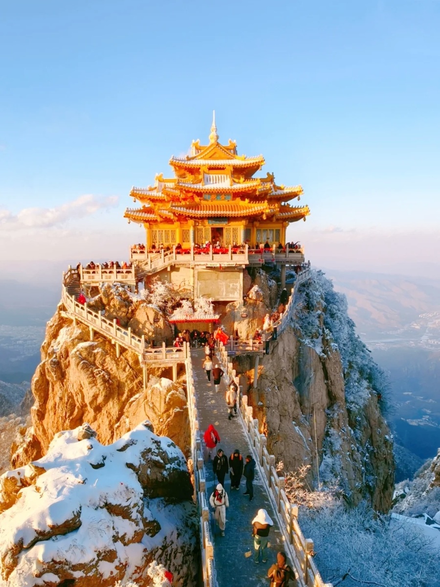 解锁老君山冬日限定雪景,目之所及皆为银装素裹的浪漫;在山顶金鼎静候日出东方、目送日落熔金,定格绝美光影;